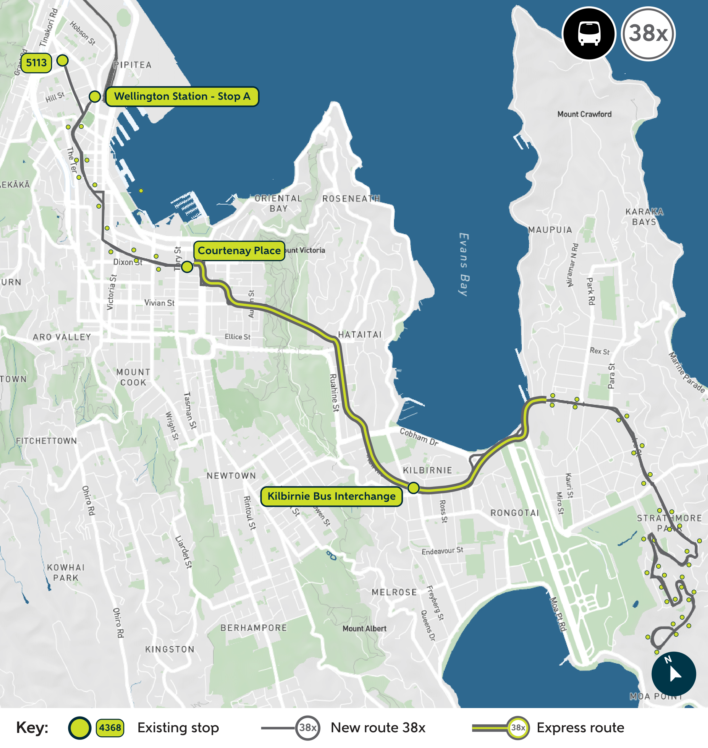 The 38x will stop at all stops between Stop 7099 (Strathmore Park - Kekerenga Street) and Stop 7080 (Miramar Avenue at Portsmouth Road). From there it is express to Courtenay Place - only stopping at Kilbirnie Bus Interchange. Then it stops at all stops between Courtney Place Stop A and Wellington Station Stop A.
